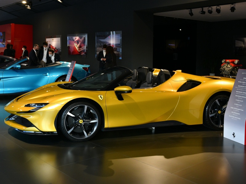 SF90スパイダーはストラダーレのオープンモデルであり、日本では2021年に登場しました。ルーフ部分はハードトップが採用され、クローズ時の静音性にも優れています。ルーフの開閉は14秒と早く、いつでもオープン走行が楽しめる仕様になっています。エンジンはストラダーレと同じV型8気筒・4.0Lツインターボを搭載し、3基のモーターと合わせると1000psを発生させます。動力性能はストラダーレと同じですが、トランスミッションに関しては一新されており、細かい変更が加えられ最適化されました。スパイダーはオープンながらルーフを閉めている状態ではストラダーレと性能は変わらず、オープンにしても風や音を最小限に抑えた走行が楽しめます。